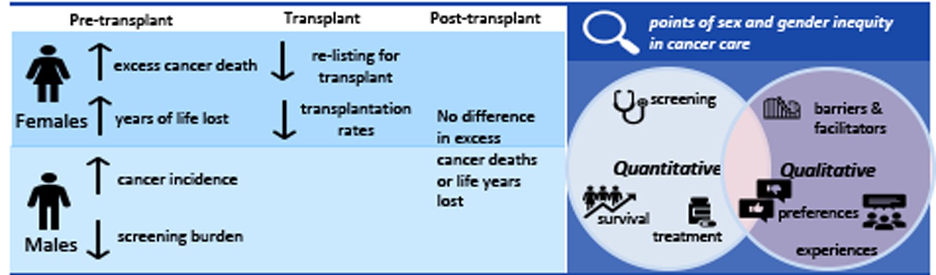 Cancer disproportionally impacts kidney transplant recipients, but it affects men and women differently. Male kidney transplant recipients have higher absolute cancer incidence and mortality compared to females; however, female kidney transplant recipients experience greater excess cancer death(1,2). Sex and gender differences have also been described in access to healthcare and consequently there has been an increase of gender-based health plans, particularly in cardiovascular disease(3,4).