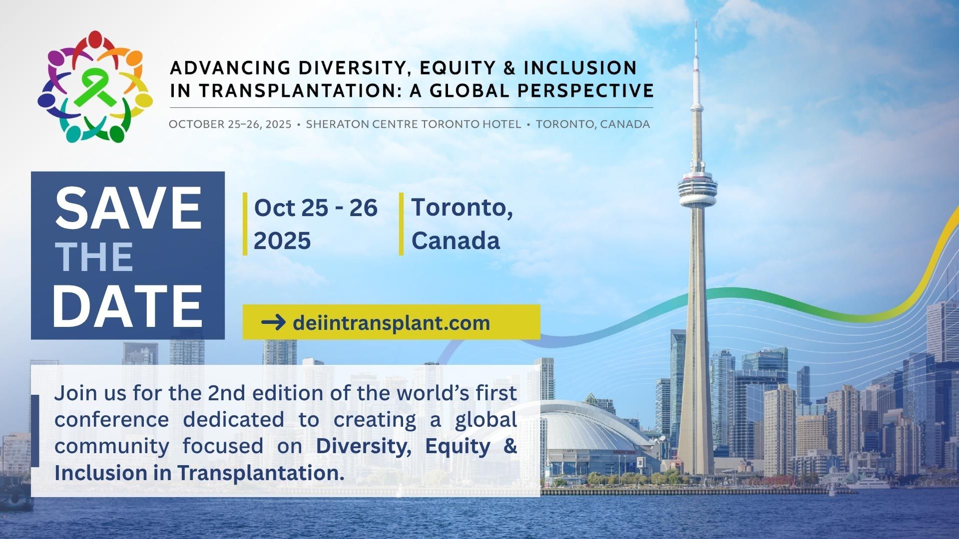 Registration is now open for the 2025 Advancing Diversity, Equity & Inclusion in Transplantation: A Global Perspective Conference, taking place October 25 - 26, 2025 in Toronto, Ontario, Canada. This second edition will be co-located with the 6th Congress of International Advanced HBP Surgery (ISLS 2025) featuring a Joint Session with Keynote Speaker Dr. Nouman Ashraf addressing "Enabling Exemplary Care Through Behavioural Empathy"